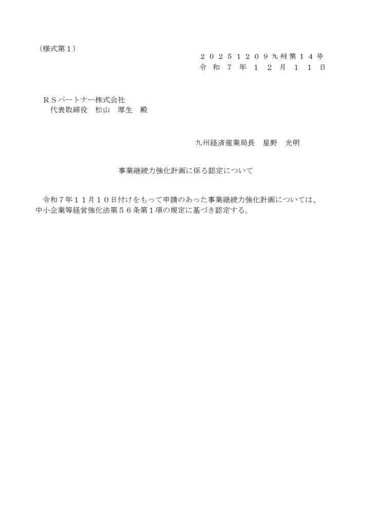 HOME > お知らせ 2025.12.11 事業継続力強化計画の認定について この度、2025年12月11日付けで、事業継続力強化計画が認定されました。 一覧 次の記事へ≫ 最新のお知らせ 2026.03.09 健康経営優良法人2026 認定 2025.12.18 2025年度 ERM資格について 2025.12.11 事業継続力強化計画の認定について
