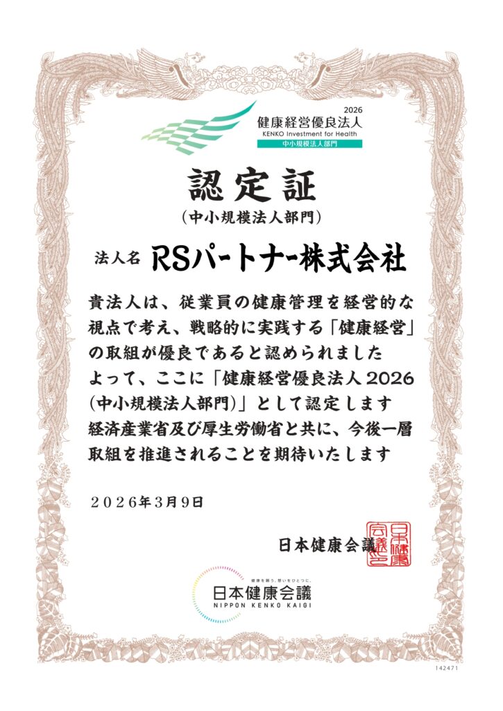 HOME > お知らせ 2026.03.09 健康経営優良法人2026 認定 この度、2026年3月9日付けで健康経営優良法人2026(中小企業法人部門)の認定を受けました。 ≪前の記事へ 一覧 最新のお知らせ 2026.03.09 健康経営優良法人2026 認定 2025.12.18 2025年度 ERM資格について 2025.12.11 事業継続力強化計画の認定について
